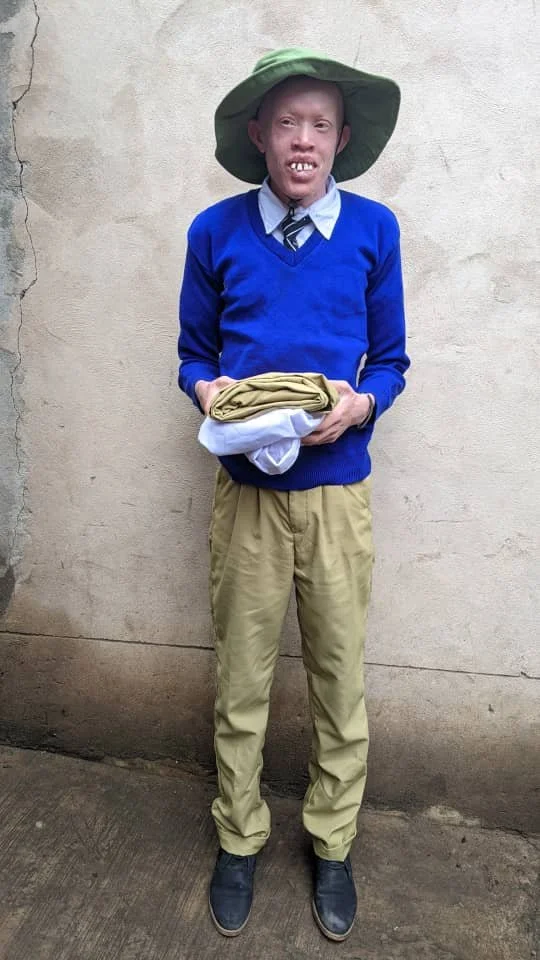 Faida Kifafa är äldre än sina 15-åringar klasskompisar. Men eftersom han har missat så mycket i skolan så ligger han efter och får gå med de som är yngre än han själv. På bilderna syns han i sin gamla och nya skoluniform som han fick från Albinism Awareness.